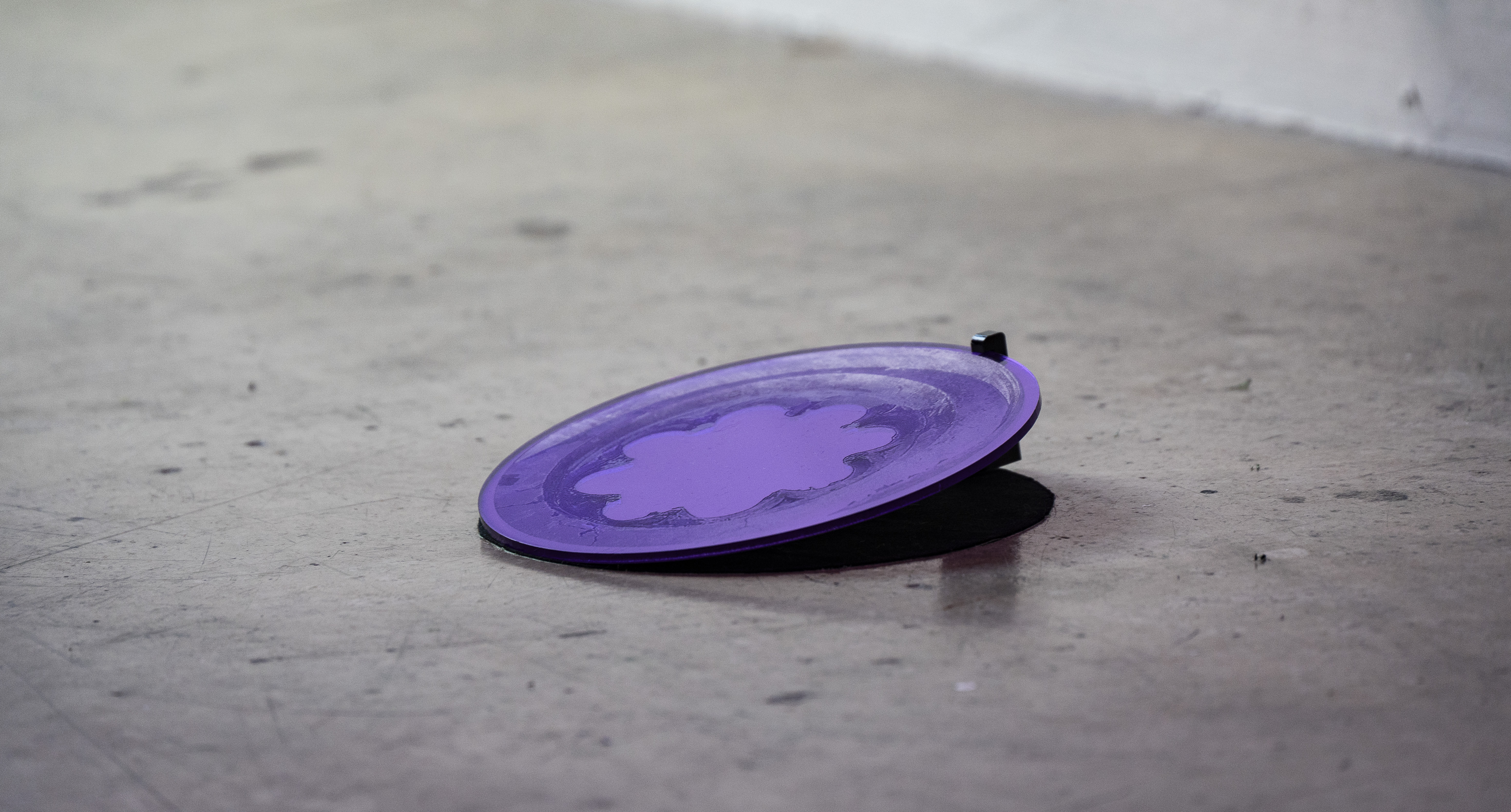 The installation presented here is the result of a process in which the artist appropriates images of one of these sites in Port-au-Prince, currently shared on the Web, by breaking them up. Etched in a reflective, purplish acrylic, the fragments bear witness to a monumental architectural construction where nature has reclaimed its rights. They are superimposed on the reflection of the gallery space in which they are placed, making them part of the present, here and now. Through these formal gestures, the artist updates her references to a city as it persists in her imagination, and proposes a new, precarious arrangement.